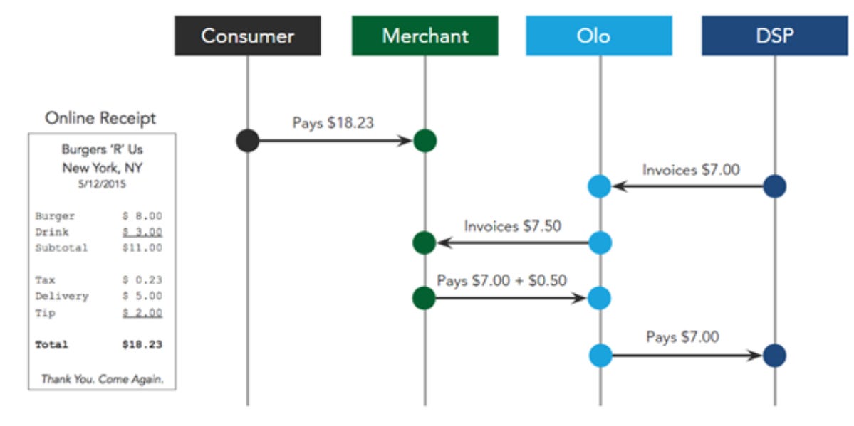 Revenue model: Olo charges restaurants (link), aggregators (Dash agreement) and other channel partners on a per transaction basis. There are two revenue streams here: