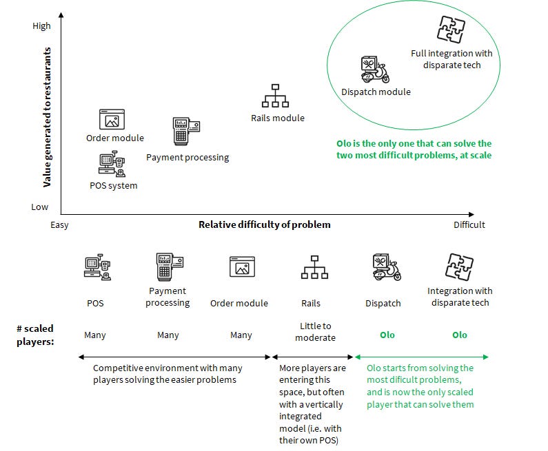 Businesses exist to solve problems. Generally, the level of monetisation and the defensibility of that monetisation depends on the difficulty of solving those problems and whether there is a path to replicating that business. This is why we generally do not like businesses that compete with their ecosystem (i.e., those whose incentives do not align with their suppliers/users), instead preferring those that enrich it. Olo belongs to the latter.